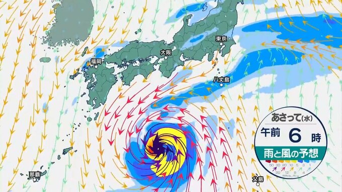 その後、あさって水曜日から木曜日にかけて、太平洋側を中心に台風の北側に広がる雨雲がかかってくるでしょう。まだ予報に幅があり、予報円の北側を通った場合は、東海や関東の太平洋側を中心に雨や風が強まり、大荒れの天気となるおそれがありますので、今後の情報にご注意ください。
