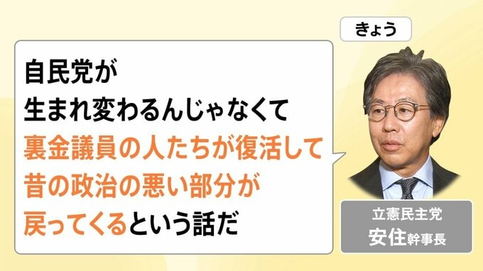 高市氏は選挙中から「裏金問題は決着済み」という立場でした。それに対して、立憲民主党の安住幹事長は6日、「自民党が生まれ変わるんじゃなくて、裏金議員の人たちが復活して、昔の政治の悪い部分が戻ってくるという話だ」と強く牽制しています。