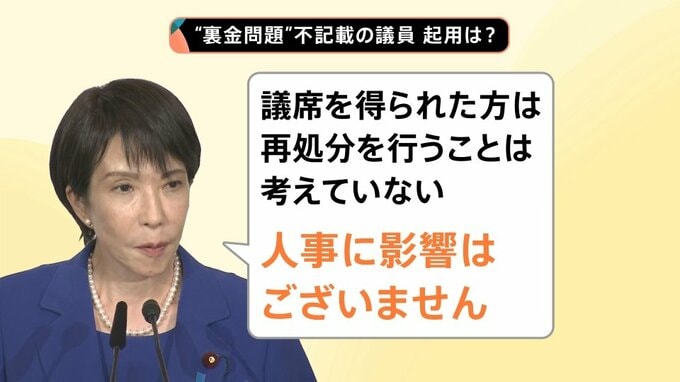 その中で、高市氏はかねてより裏金問題不記載議員については「議席を得られた方は再処分を行うことは考えていない。人事に影響はございません」と一貫していました。