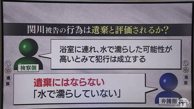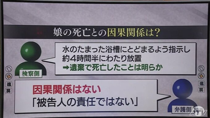 検察側は、水のたまった浴槽にとどまるよう指示し、約4時間半にわたり放置したことは危険であり、遺棄で死亡したことは明らかであるとしました。これに対し、弁護側は、因果関係を否定しています。