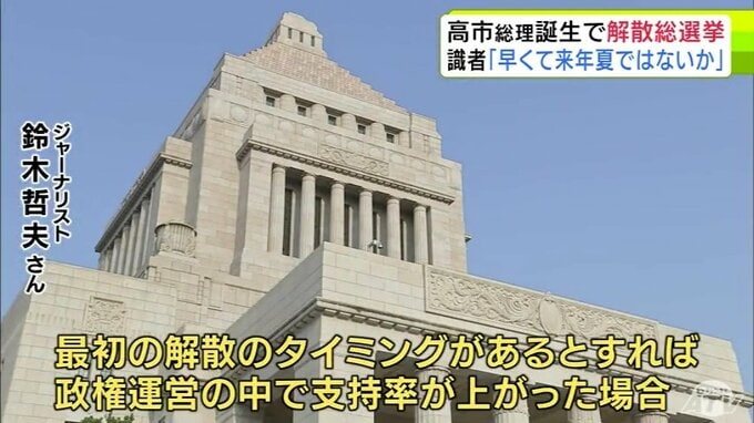 長年、永田町を取材するジャーナリストの鈴木哲夫さんは、高市総理が誕生した場合、解散総選挙が行われるタイミングについて、「当面はなく、早くても来年夏ではないか」という見通しを示しました。