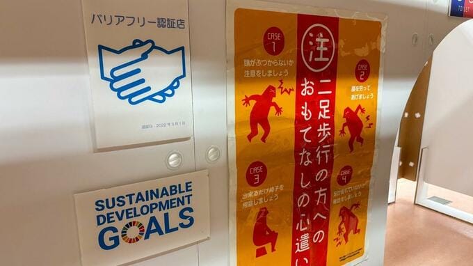 天井の高さは160cm。たいていの大人は頭をぶつけそうになり、かがみこみ、中腰で動くことになりますが、車椅子の店員はそのまま動き回ります。