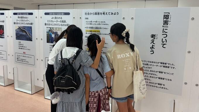 レストランの外に出ると、体験を振り返って考えるため、「社会から障害を考えてみよう」という一連のパネルへ「生徒が作った映像」で誘導されます。