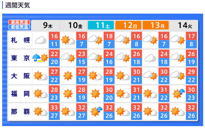 台風22号(ハーロン)日本列島接近 関東地方への影響を詳しく…今後の進路と勢力は?雨、風、波は?気象庁発表データ 全国主要都市の週間天気も掲載 近畿・東海にも接近 テレビユー山形 2025年10月7日(火) 05:27 国内 ■全国主要都市の週間天気予報(画像)