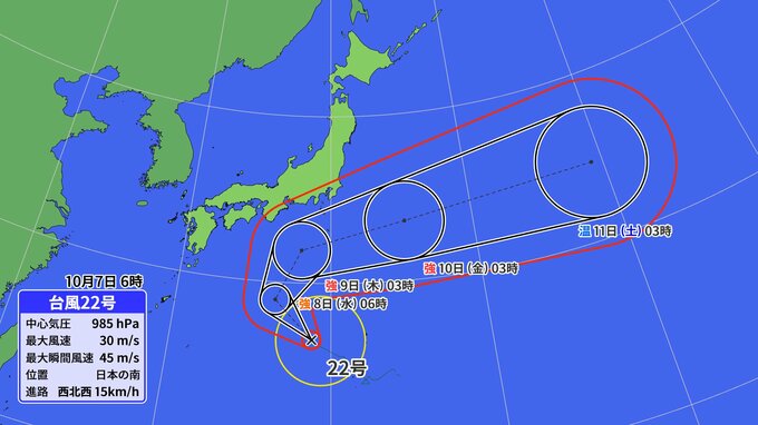 台風22号(ハーロン)は、あさって9日(木)にかけ近畿地方の南の海上に接近し進路を東よりに変える見込みです。進路はだんだん定まってきたものの、台風の中心が予報円の北側を通った場合、太平洋側の地域に影響が出るおそれがあります。最新の情報を逐一チェックするようにしてください。11日(土)には、温帯低気圧に変わる見込みです。