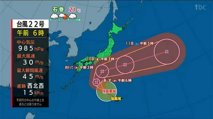 台風22号については、あす8日にかけて強い勢力に発達し、その後非常に強い勢力となって本州の南を東に進む予想です。進路がほぼ固まってきており、この進路であれば宮城県内への大きな影響はなさそうです。