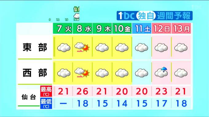 仙台では、朝の18℃から最高気温は23℃までしか上がらない予想となっています。日中の多くの時間帯で気温は20℃前後か、それを下回る状況が続く見込みです。沿岸地域では北東の風がやや強めに吹くため、体感温度はさらに低く感じられる可能性があります。一方で、夜間は雲が多いため放射冷却が抑えられ、あす=8日朝の最低気温は18℃と今朝よりもやや高い予想となっています。