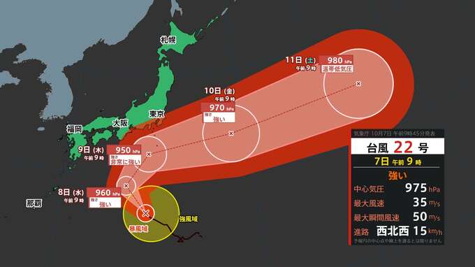 強い台風22号は、日本の南を1時間におよそ15キロの速さで西北西へ進んでいて、9日(木)には「非常に強い」勢力に発達し、本州南岸を進む見込みです。また、新たな「台風のたまご=熱帯低気圧」も発生しました。11日(土)ごろから影響が出る可能性があります。