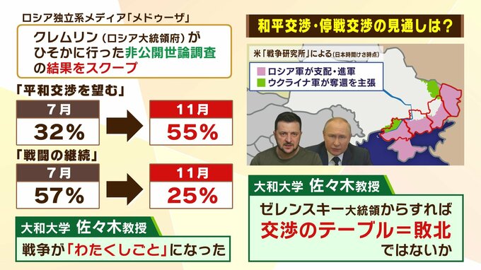 レバダセンターという独立系の世論調査機関でも同じような調査結果が出ておりますので、やはり戦争継続ではなく、平和交渉を臨むというのが出てるのは間違いないと思います」