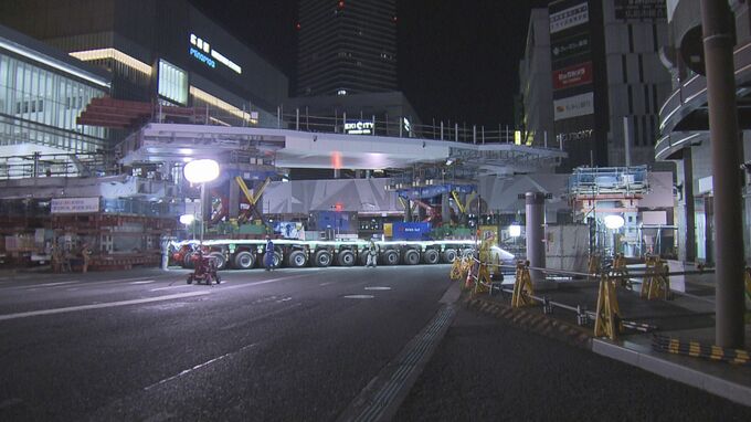 この工事は、広島駅周辺の回遊性の向上を目的に進められています。7日未明には、96個のタイヤがついた自走式の台車で橋桁が運ばれ、1時間ほどで移動を完了。続けて作業員がそばにつき、慎重に高さを調節しながら、メジャーなども使って、細かなずれを直していました。夜を徹した作業は午前4時ごろ、終了しました。