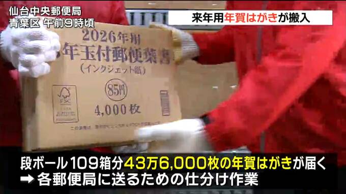 青葉区にある仙台中央郵便局には午前9時頃、段ボール109箱分、43万6000枚の年賀はがきが届き、各郵便局に送るための仕分け作業が行われました。