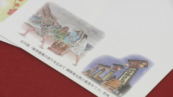 石川県版の絵入りハガキには、御陣乗太鼓や能登キリコが描かれ、今年も能登復興への思いが込められています。