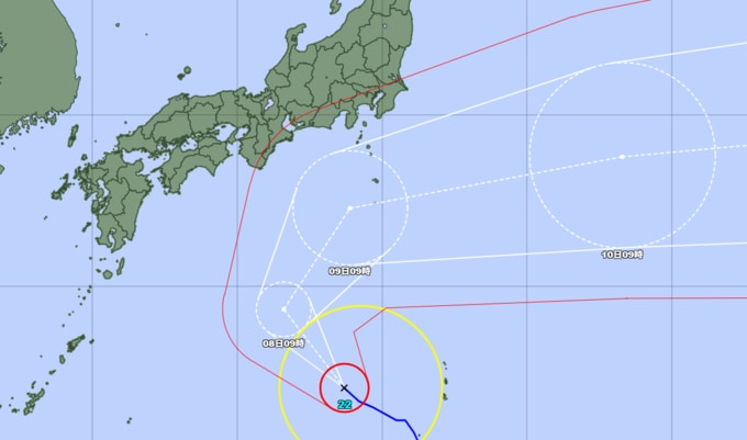 伊豆諸島では、前線や台風本体の発達した雨雲により、8日は雷を伴った激しい雨が、9日は非常に激しい雨の降る所があるでしょう。