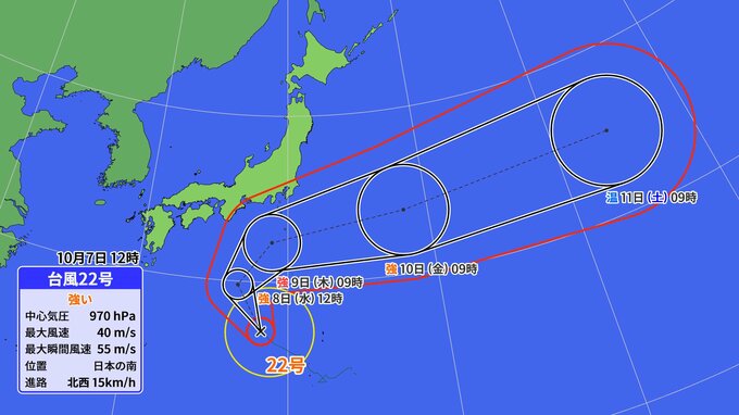 台風22号は暖かい海面水温エリアを通過していて、水蒸気をエネルギーにして、発達する見込みです。あすには、進路を東寄りに変えて、週後半は関東や東海で強風や高波の影響が出るおそれがあります。