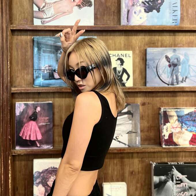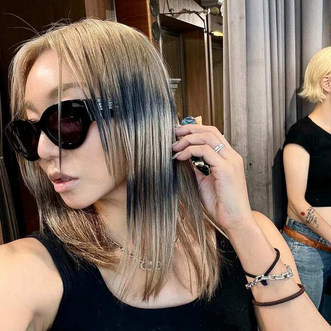 投稿された複数の写真では、髪の途中が黒く根元や毛先が明るいブロンドのツートーンカラーになった髪色が確認できます。サングラスをかけたクールな表情の写真や、木製の壁と写真が飾られたスタジオのような空間での撮影カットも公開されています。