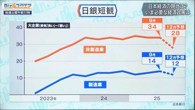 ――トランプ関税の影響で製造業は6月・9月ともに下がるのではと言われていたが2期連続の改善。非製造業も実質賃金が物価高で抑えられているので心配されていたが高い水準を推移している。