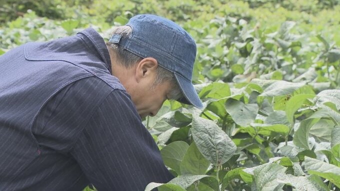 町特産の「あけぼの大豆」の枝豆の収穫が始まり、浅野さんは実入りのいいさやを選び丁寧に摘み取っていました。