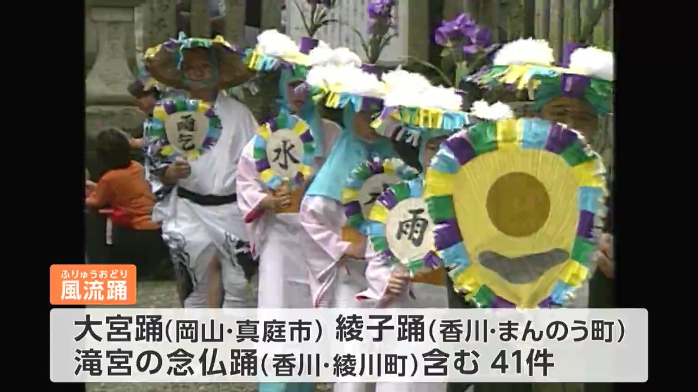 「風流踊」は、このほか真庭市の「大宮踊」。香川県の「綾子踊」や「滝宮の念仏踊」など24都府県41件の国指定重要無形文化財で構成されています。