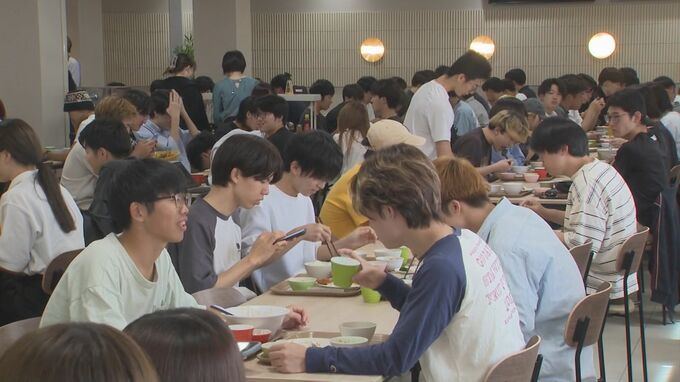 「現在ランチタイムです、大勢の学生で賑わっています」