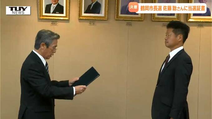 任期満了に伴いおととい行われた鶴岡市長選挙で現職を破り初当選を果たした佐藤聡さんにきょう、当選証書が手渡されました。