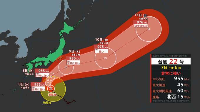 先に日本に近づく強い台風22号は、8日(水)には「非常に強い」勢力に発達し、本州南岸を進む見込みです。予報円の中心を進んだ場合、台風本体の雨雲はかからなくて済みそうですが、関東地方や東海地方では、8日(水)9日(木)は台風の外側の雨雲がかかり、雨が降りやすくなるでしょう。