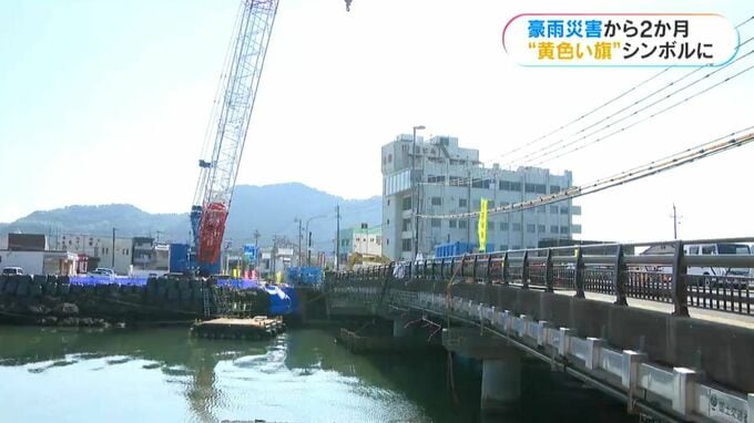 網掛橋の沿道に黄色の旗が風に揺られています。旗を立てたのは、網掛橋周辺に店舗をかまえる「網掛橋復興臨時通り会」のメンバー7人です。