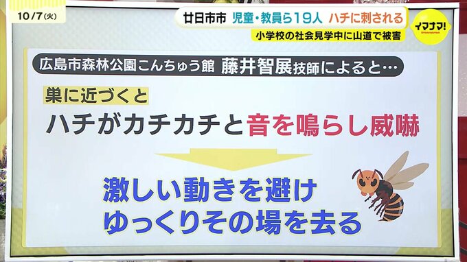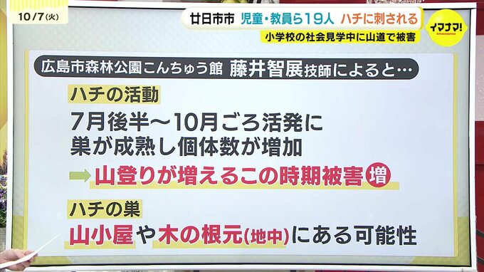 広島市森林公園こんちゅう館の藤井智展技師によりますと、ハチの活動が活発になるのは、7月後半から10月ころ。巣が成熟し、個体数も増えるそうです。