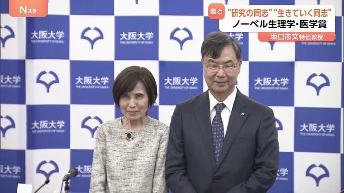ノーベル生理学・医学賞に選ばれた大阪大学の坂口志文特任教授。「研究の同志」と称えた妻とともに会見に臨みました。今年のノーベル生理学・医学賞にアメリカの2人の研究者とともに選ばれた大阪大学の坂口志文特…