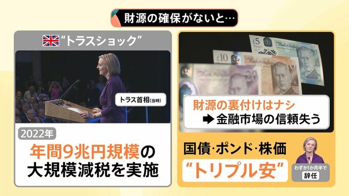 しかし、この財源の裏付けはなく、金融市場の信頼を失い、結局国債・ポンド・株価の“トリプル安”となり、わずか1か月で責任をとって辞任に追い込まれるという事態がありました。