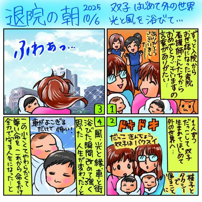 翔子さんは、今回も絵日記でこの日のことを報告。母・桂子さんと一人ずつ赤ちゃんを抱いて外に出る際の心境を「だっこきんちょう 双子はバクスイ」と描いています。そして翔子さんは「車がよこぎるだけで怖い!」「この小さくてやわらかくて尊い命を」「これから命をかけ全力で守る人生になった」と、育児への決意を新たにしています。