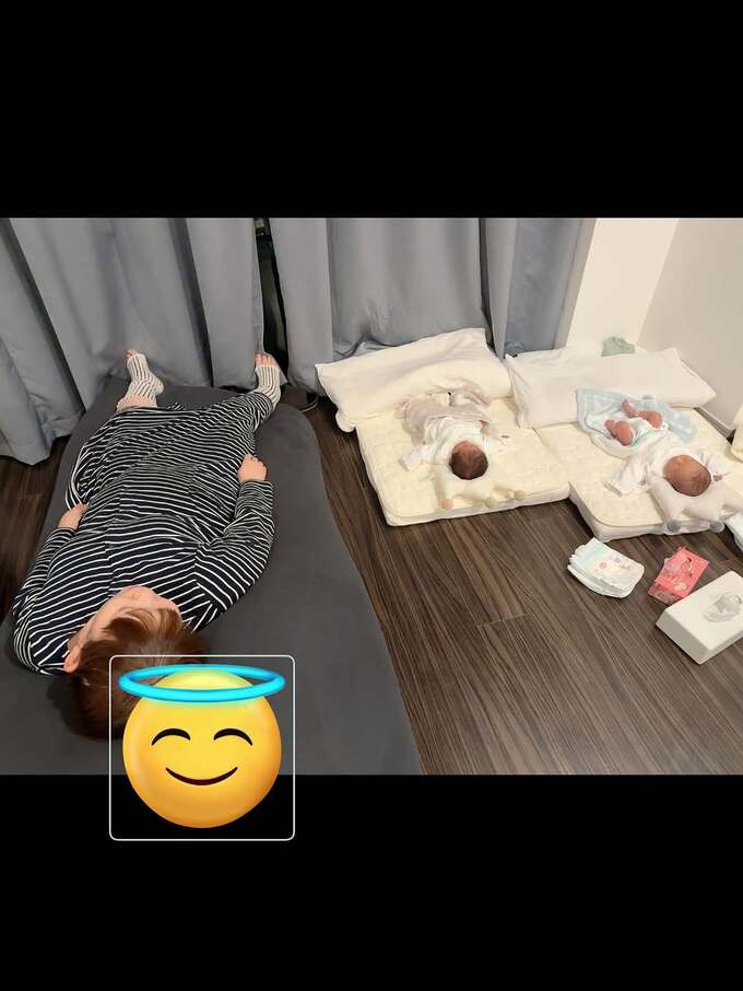そして翔子さんは「一週間前にはお腹の中にいた双子と川の字で寝た不思議」とテキスト。床に敷いたベビーマットに双子、その側に翔子さんが並んで寝ている様子の写真を投稿し、これらの絵日記を「いまのストレス発散と双子へのいつかのプレゼント」と、その日を楽しみにしている模様です。