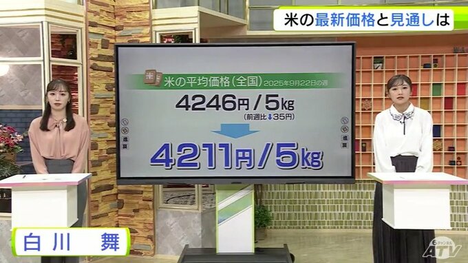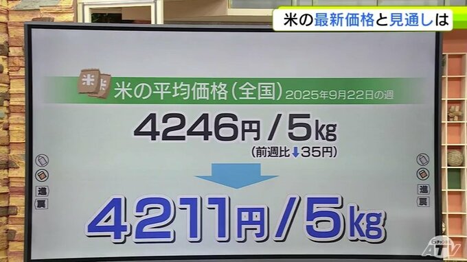 改めて、コメの価格の最新情報を見ていきましょう。全国のスーパーなど約1000店舗で9月22日までの1週間に販売されたコメの平均価格は、5キロあたり4211円と、前の週から35円下がり、2週連続の値下がりとなっています。