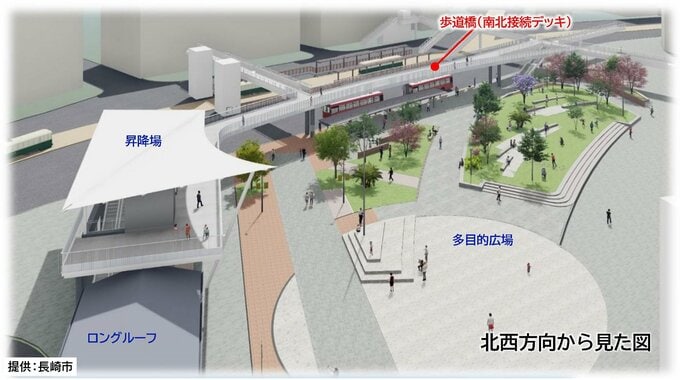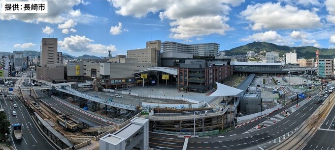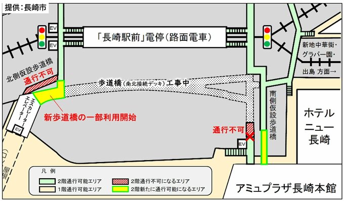 長崎市は、長崎駅東口のかつての高架広場に替わる歩道橋の工事を進めていて、今後、仮設歩道橋の撤去などのため、歩行者の動線が変更されます。