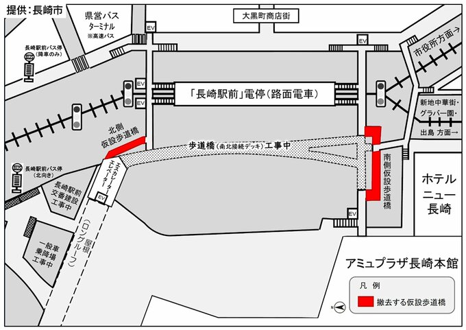 12月中旬からは、南側仮設歩道橋が撤去され、2026年2月中旬くらいまでの間、長崎駅前電停と大波止方面の移動には迂回が必要となります。