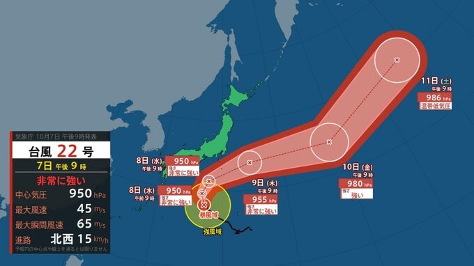 気象庁によりますと、非常に強い台風22号は、きょう(7日)午後9時には日本の南にあって、1時間におよそ15キロの速さで北西へ進んでいます。