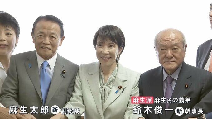 高市氏の左隣には麻生副総裁、右隣には、麻生氏の義理の弟で麻生派幹部の鈴木幹事長が並ぶ新たな布陣。総務会長に選ばれた有村氏も麻生派です。