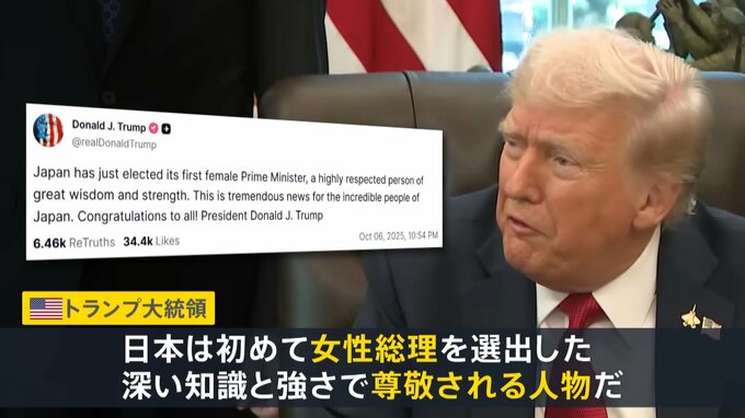 まだ、高市新総裁の総理就任が決まったわけではありませんが、アメリカのトランプ大統領からは、「日本は初めて女性総理を選出した。深い知識と強さで尊敬される人物だ」と祝福メッセージが。