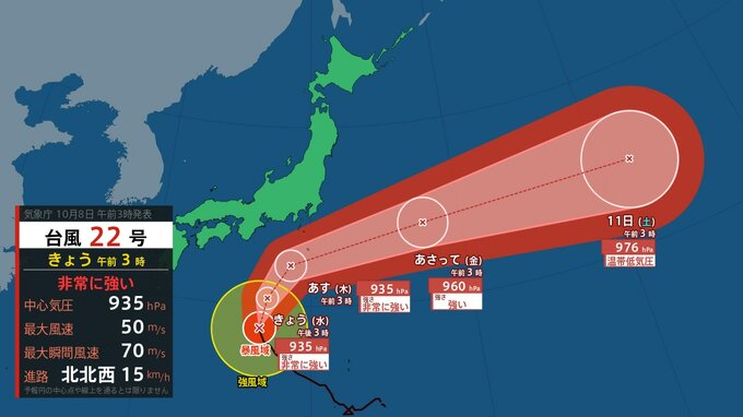 非常に強い台風22号は、8日3時には日本の南にあって、1時間におよそ15キロの速さで北北西へ進んでいます。中心の気圧は935ヘクトパスカル、中心付近の最大風速は50メートル、最大瞬間風速は70メートルで中心から半径95キロ以内では風速25メートル以上の暴風となっています。