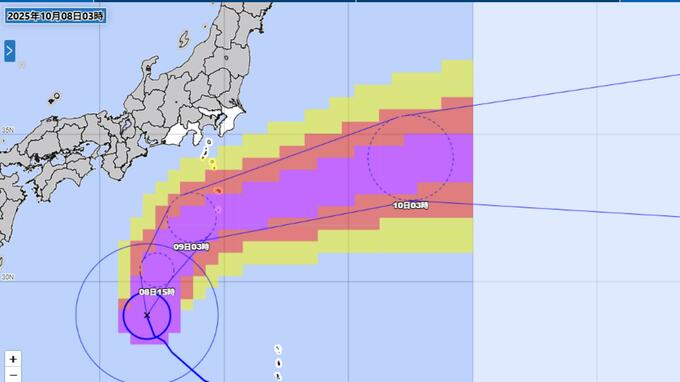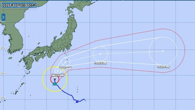 非常に強い台風22号は、日本の南を時速15キロの速さで北北西へ進んでいます。台風は非常に強い勢力を維持しながら進路を次第に東へ変え、伊豆諸島付近を東北東へ進む見込みです。また、前線が9日朝にかけて日本の東から伊豆諸島付近にかけてほとんど停滞する見込みです。伊豆諸島では、9日は一部の住家が倒壊するおそれもある猛烈な風が吹く見込みです。
