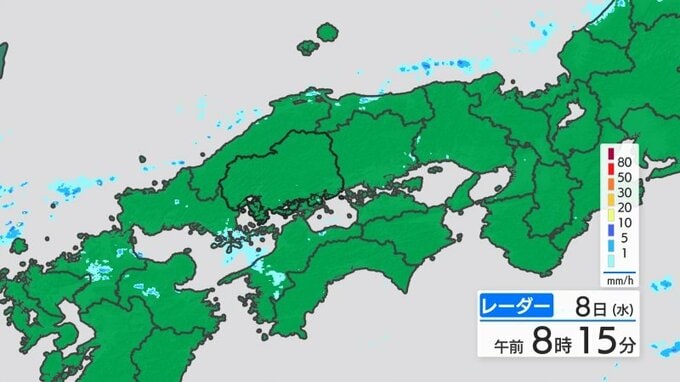 きょう8日(水)の広島県内は、ところどころ弱い雨が降り、気温が下がりにくい朝でした。最低気温は、広島市中区で24.0℃、呉市23.9℃、三次市20.6℃で、平年のこの時期とくらべると8℃くらい高くなっています。