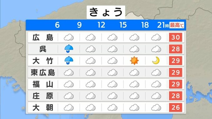 このあとも湿った空気が充満し、雲が多い天気でしょう。大きな崩れはないものの、弱い雨が落ちてくる見込みです。薄日が差す時間もあり、かなり蒸し暑いでしょう。最高気温は、広島30℃、呉・庄原28℃、福山29℃の予想です。きょうは、こまめな水分補給を心がけ、熱中症に警戒してください。
