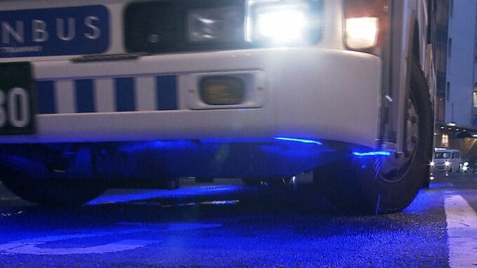 6色のLEDライトが取り付けられた路線バス約60台が街中を通常ダイヤで運行するとともにバス停の掲示板もカラフルに彩られています。