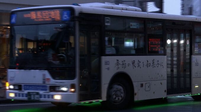 天満屋のバスステーションにやってきたのは、カラフルな光を放つ路線バスです。岡山市中心部で開かれている岡山芸術交流の作品の一つとして、ジェームズ・チンランドさんが手がけた「レインボーバスライン」