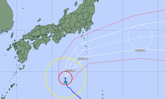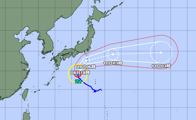台風第22号は、9日は非常に強い勢力で伊豆諸島付近を東北東へ進む見込みです。伊豆諸島では、暴風やうねりを伴う高波に厳重に警戒してください。また、土砂災害、低い土地の浸水、河川の増水や氾濫に厳重に警戒してください。