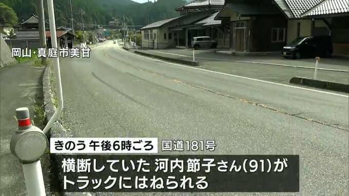 きのう(7日)午後6時ごろ、真庭市美甘の国道181号を歩いて横断していた、近くに住む河内節子さん(91)がトラックにはねられました。河内さんは全身を強く打ち病院に救急搬送されましたが、その後死亡が確認されました。