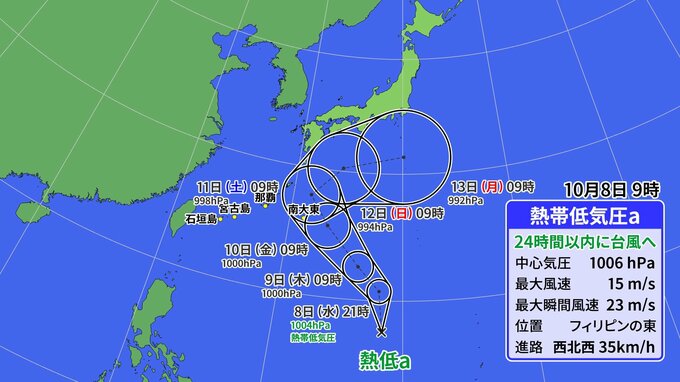8日9時の観測によると、熱帯低気圧がフィリピンの東の北緯17度40分、東経138度25分にあって、1時間に約35キロの速さで西北西へ進んでいます。中心の気圧は1006ヘクトパスカル、最大風速は15メートル、最大瞬間風速は23メートルとなっています。