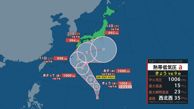 熱帯低気圧はきょう(8日)午前9時、フィリピンの東にあって、1時間に35キロの速さで西北西へ進んでいます。