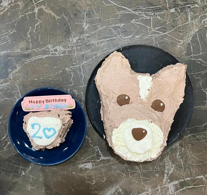 照英さんは「本日2025年10月8日『愛犬テン20歳の誕生日を迎えました!』」と報告。テンの顔をかたどったケーキの写真を投稿し「このケーキは妻&長女(15歳)&次女(8歳)が手作りで作ってくれたスペシャルテンテンケーキです!」と説明しています。