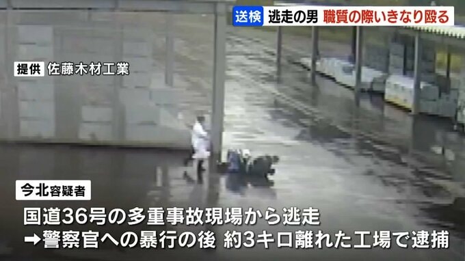 近くの国道36号では、この2時間ほど前に車10台の多重事故があり、現場から逃走した今北容疑者は警察官に暴行した後、およそ3キロ離れた工場に侵入した疑いで逮捕されていて、警察が事件の経緯などを調べています。