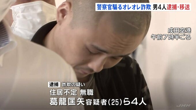マレーシアを拠点に警察官を騙るオレオレ詐欺に関与したとして男4人が逮捕され、けさ成田空港に移送されました。大阪府警の捜査員に連れられて歩く男たち。詐欺の疑いで逮捕された、いずれも住居不定・無職の葛籠…